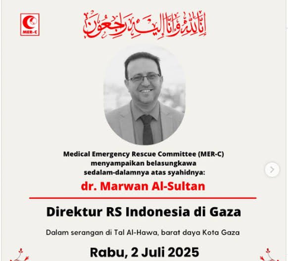 DJABARPOS.COM, Gaza — Aksi brutal militer Israel kembali menelan korban jiwa dari kalangan tenaga medis. Direktur Rumah Sakit Indonesia di Gaza Utara, Dr. Marwan Al-Sultan, tewas bersama sejumlah anggota keluarganya setelah rumahnya dihantam serangan udara pada Selasa (2/7).