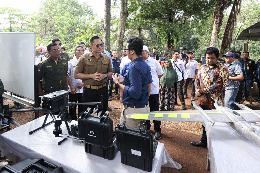 Menteri AHY bersama Direktur Jenderal Survei Pemetaan Pertanahan dan Ruang, Virgo Eresta Jaya melihat alat-alat pengukuran yang digunakan Kantor Pertanahan Kota Depok. Alat-alat tersebut dipajang di salah satu rumah warga yang berada di lokasi pengukuran. Di antara alat-alat tersebut, terdapat dua pesawat nir awak dengan tipe Quadcopter dan Fix Wing.