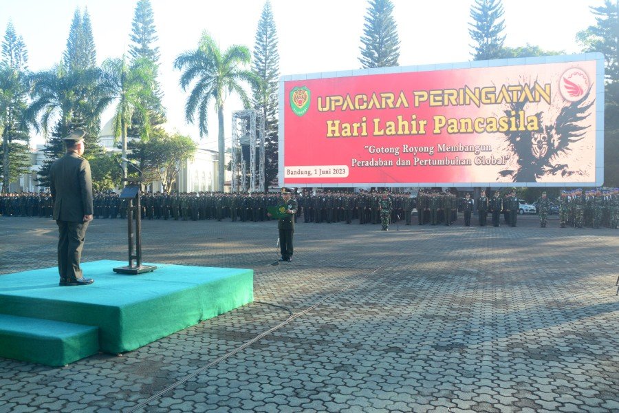 DJABARPOS.COM, Bandung, – Pangdam III/Slw Mayjen TNI Kunto Arief Wibowo S.I.P., yang diwakili oleh Kapoksahli Pangdam III/Slw Brigadir Jenderal TNI Kuat Budiman, S.I.P. bertindak sebagai Inspektur Upacara memimpin jalannya upacara peringatan Hari Lahir Pancasila yang diselenggarakan di Lapangan upacara Makodam III/Slw Jl. Aceh No. 69, Kota Bandung, Kamis, (01/06/2023).
