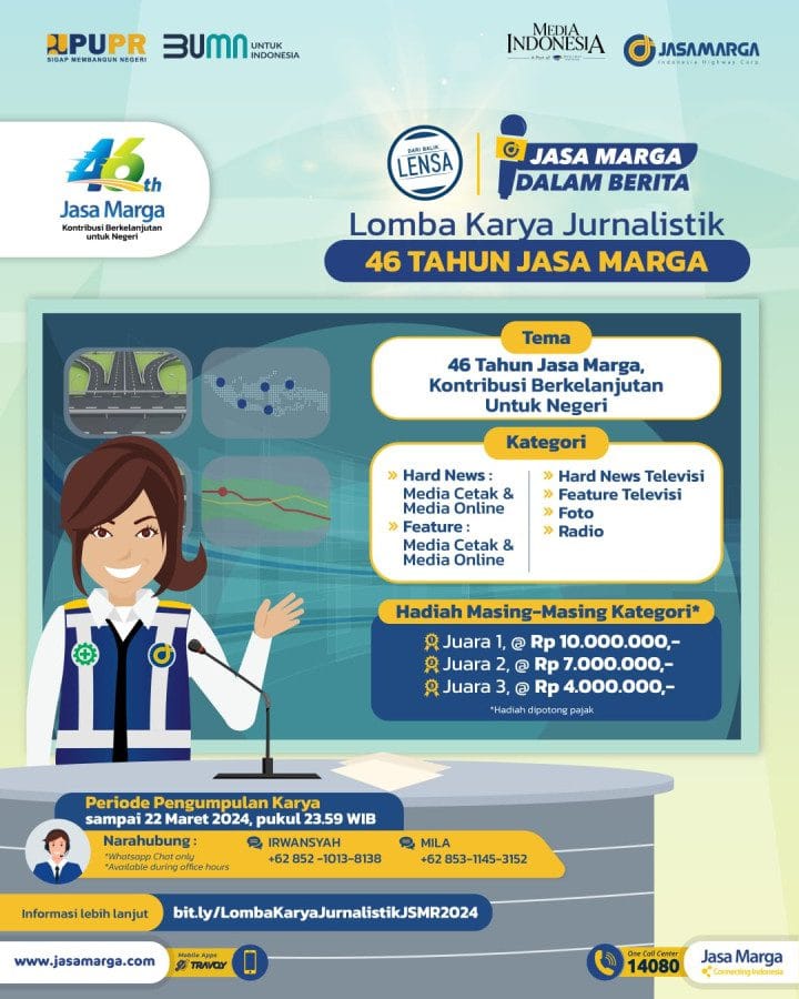 DJABARPOS.COM, Jakarta – PT Jasa Marga (Persero) Tbk kembali menggelar lomba karya jurnalistik Jasa Marga Dalam Berita. Jasa Marga Dalam Berita 2024 mengusung tema yang sama dengan tema ulang tahun ke-46 Jasa Marga yakni “46 Tahun Jasa Marga, Kontribusi Berkelanjutan Untuk Negeri”. Jasa Marga kembali mengambil 6 kategori karya yang dilombakan, yakni Hard News Media Cetak dan Online, Feature Media Cetak dan Online, Hard News Televisi, Feature Televisi, Radio dan Foto.