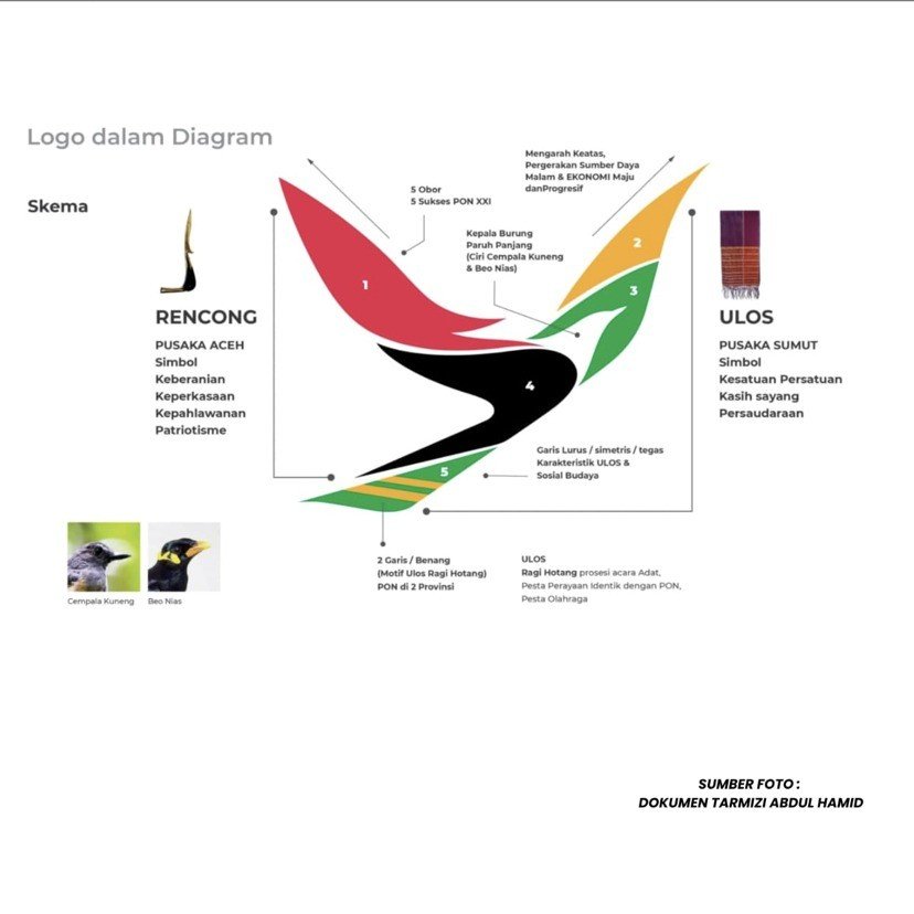 Dia melanjutkan, sedangkan simbol kepala burung paruh panjang dalam logo tersebut merupakan gambaran dari Burung Cempala Kuneng di Aceh dan Burung Beo Nias di Sumut. Sementara lima nyala api melambangkan harapan lima kesuksesan PON.