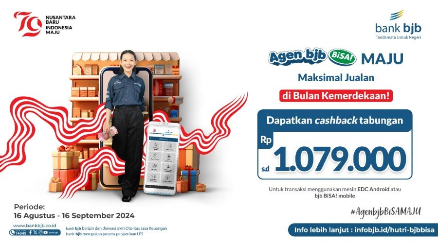 Selain itu, dalam rangka memperingati HUT Republik Indonesia yang ke-79, bank bjb menawarkan hadiah menarik bagi agen dengan jumlah transaksi terbanyak selama periode 16 Agustus hingga 16 September 2024. Terdapat beberapa kategori hadiah berupa cashback tabungan dengan jumlah yang berbeda, tergantung pada frekuensi transaksi yang dilakukan. Informasi lebih lanjut dapat mengujungi website resmi bank bjb https://bankbjb.co.id/promo/agen-bjb-bisa-maju-maksimal-jualan.