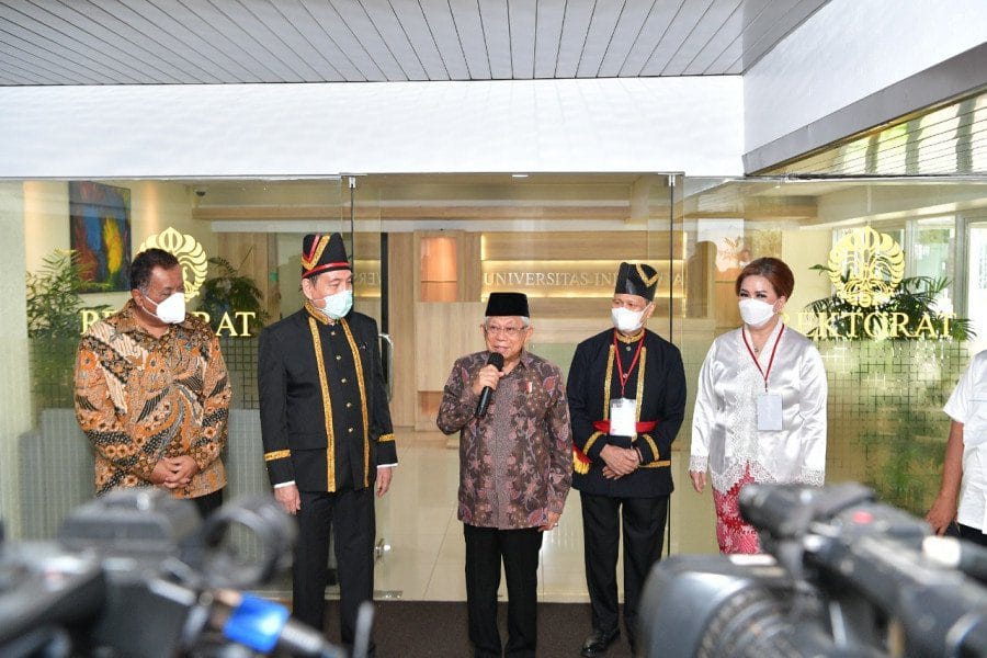 Mendampingi Wapres dalam konferensi pers kali ini, Rektor Universitas Indonesia Ari Kuncoro, Ketua Dewan Pembina Yayasan Pengembangan Kebudayaan Minahasa (YPKM) Theo L. Sambuaga, serta Ketua Dewan Pengurus YPKM Berny Tamara. (Arsy)