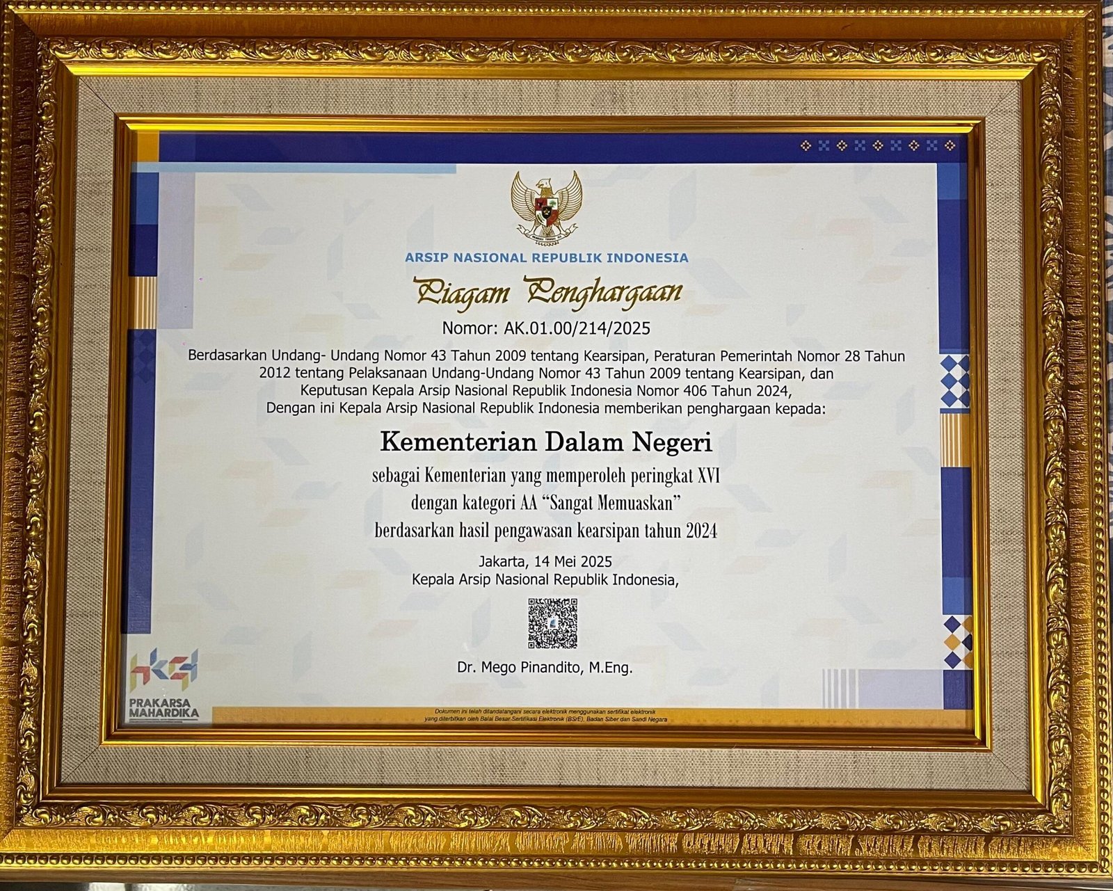 “Penghargaan ini merupakan bentuk pengakuan atas komitmen Kementerian Dalam Negeri dalam pengelolaan arsip yang tertib, profesional, dan sesuai dengan standar nasional,” ujarnya.