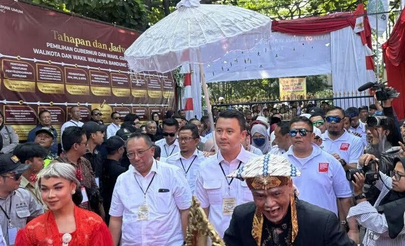Calon wali kota dan wakil wali kota Bandung Haru Suandharu dan Dhani Wirianianata diantar menggunakan delman bersama pimpinan partai politik untuk menyerahkan berkas pendaftaran Pilkada ke KPU Kota Bandung.