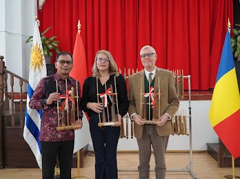 “Angklung, warisan budaya Indonesia yang telah diakui UNESCO, mengajarkan bahwa satu nada saja tidak cukup untuk membentuk melodi yang indah. Harmoni hanya tercipta ketika kita bermain bersama. Nilai kebersamaan itulah yang kami harapkan dapat menjadi jembatan persahabatan antara Indonesia, Uruguay, dan Rumania,” ujarnya (Arsy)