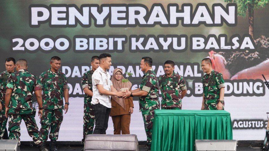 DJABARPOS.COM, Bandung – Komandan Distrik Militer (Dandim) 0624/Kabupaten Bandung Letkol Inf Hamzah, menerima penyerahan bibit pohon kayu Balsa sebanyak 2.000 pohon dari Bapak Zaenal Samsudin yang disaksikan langsung Pangdam III/Slw Mayjen TNI Kunto Arief Wibowo, dilaksanakan di Daerah Latihan (Rahlat) Kodam III/Slw tepatnya di Rancabali Ciwidey, Kab. Bandung, Jawa Barat.