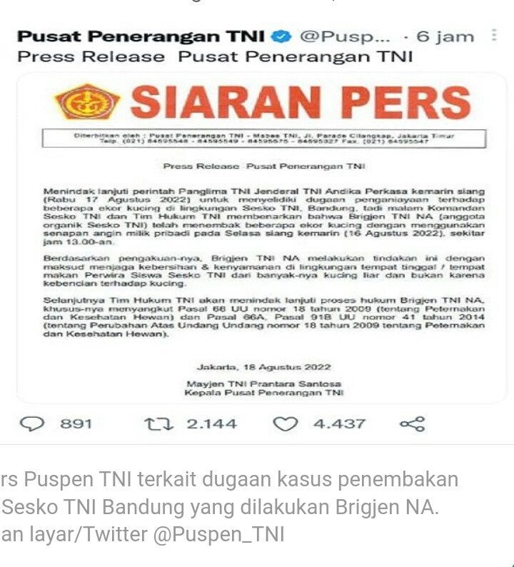 “Tadi malam Komandan Sesko TNI dan Tim Hukum TNI membenarkan bahwa Brigjen TNI NA (anggota organik Sesko TNI) telah menembak beberapa ekor kucing dengan menggunakan senapan angin milik pribadi pada Selasa siang kemarin (16 Agustus 2022) sekitar jam 13.00-an,” kata keterangan resmi Puspen TNI.