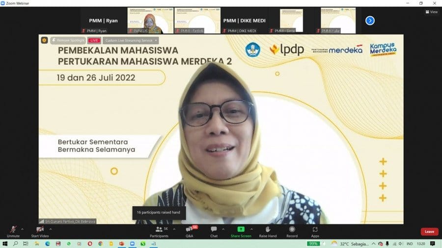 DJABARPOS.COM, Jakarta – Mahasiswa peserta Program Pertukaran Mahasiswa Merdeka (PMM) 2 tahun 2022 mulai dipersiapkan untuk berperan serta di setiap perguruan tinggi (PT) tujuan mereka. Pembekalan bagi para mahasiswa tersebut dilaksanakan selama dua hari oleh Direktorat Jenderal Pendidikan Tinggi, Riset, dan Teknologi (Ditjen Diktiristek), Kementerian Pendidikan, Kebudayaan, Riset, dan Teknologi (Kemendikbudristek), Selasa (19/7) dan Rabu (26/7). Kegiatan ini dilaksanakan secara daring melalui zoom meeting dan siaran langsung di akun Youtube Ditjen Diktiristek.