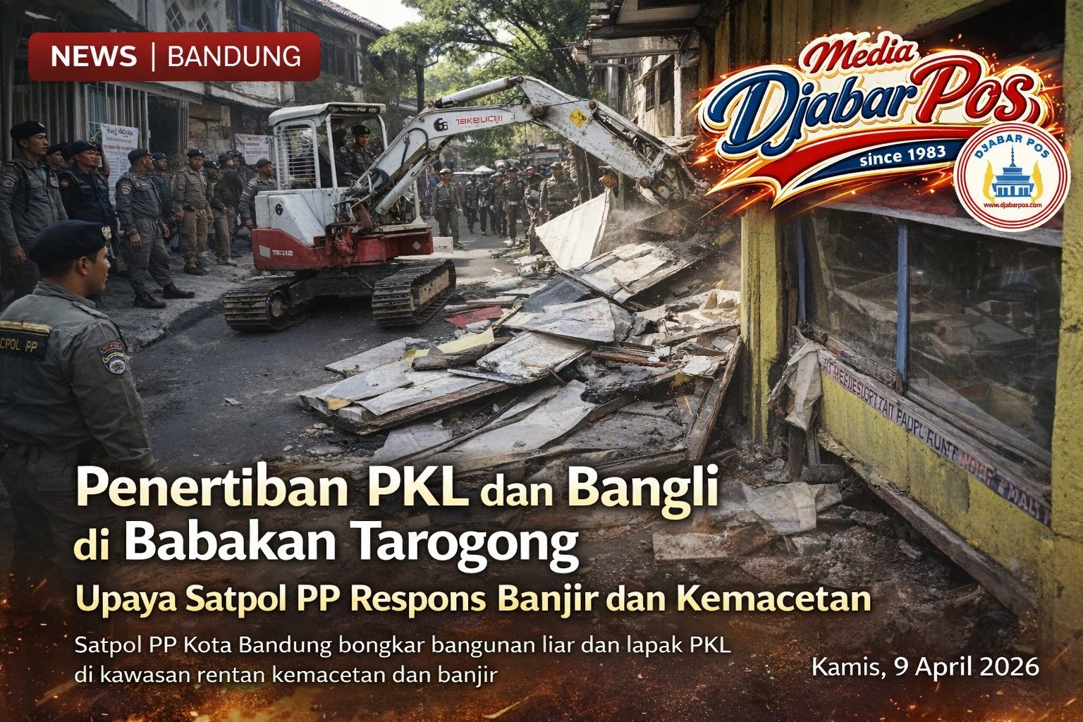 DJABARPOS.COM, Kota Bandung – Satuan Polisi Pamong Praja (Satpol PP) Kota Bandung menertibkan bangunan liar (bangli) dan Pedagang Kaki Lima (PKL) di Jalan Babakan Tarogong, RW 03, Kelurahan Sukaasih, Kecamatan Bojongloa Kaler, Kamis (9/4/2026). Langkah ini diambil sebagai respons atas keluhan warga terkait banjir dan kemacetan yang kerap terjadi di kawasan tersebut.