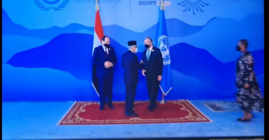 Setibanya di SHICC, Wapres disambut langsung oleh Presiden El-Sisi dan Sekretaris Jenderal PBB Antonio Guterres. Usai berjabat tangan dan saling menyapa, Wapres kemudian menuju ruang konferensi untuk mengikuti upacara pembukaan KTT COP27.