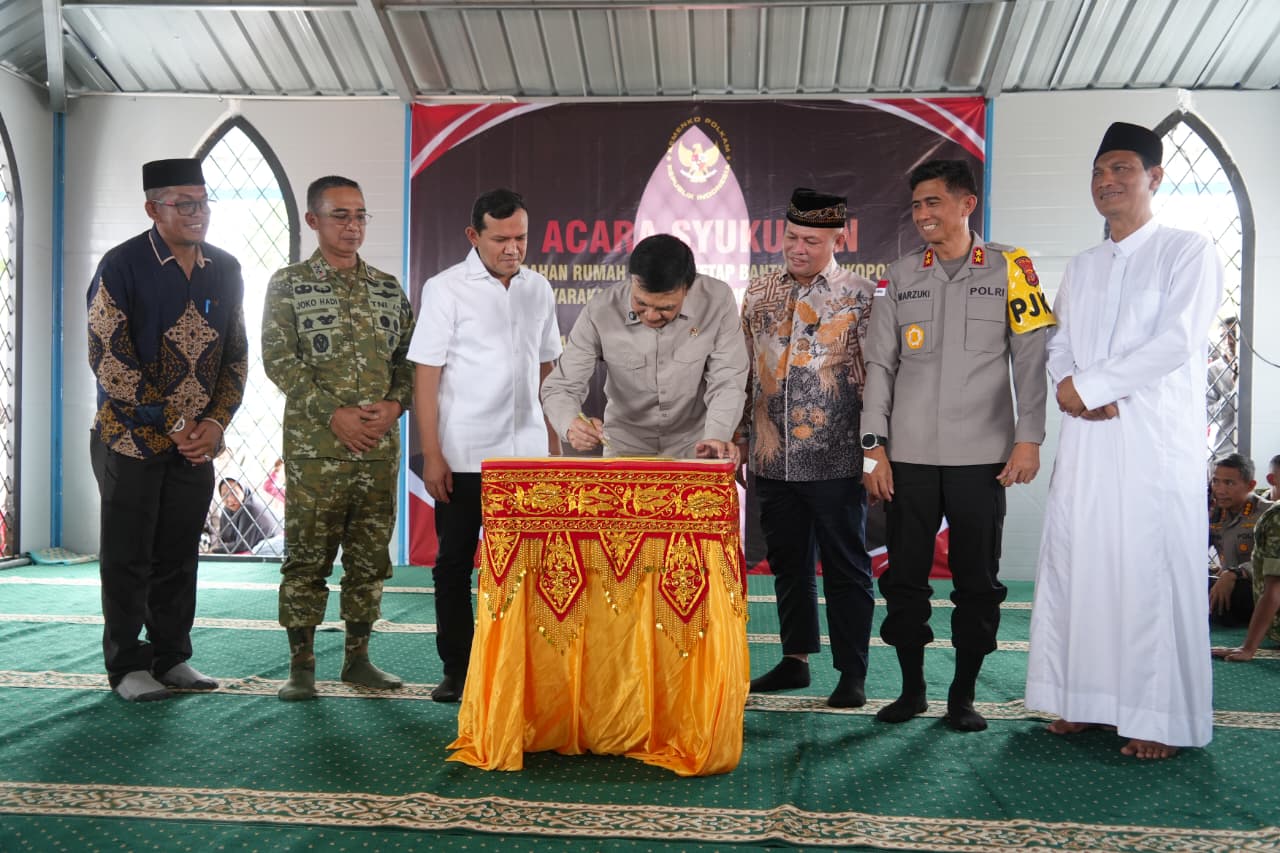 DJABARPOS.COM, Jakarta – selaku Menteri Koordinator Bidang Politik dan Keamanan meresmikan penyerahan 104 unit hunian tetap (Huntap) bagi masyarakat korban bencana hidrometeorologi di . Penyerahan bantuan tersebut berlangsung di kompleks hunian tetap Kampung Kuala Cangkoy, Kecamatan Lapang, Kabupaten Aceh Utara, Sabtu (14/3/2026). Program ini menjadi bukti nyata kehadiran negara dalam membantu masyarakat yang terdampak bencana agar dapat kembali hidup layak.