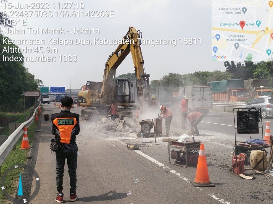 - Jumat, 16 juni 2023 Pukul 09.00 WIB s.d. Sabtu, 17 Juni 2023 (Open Traffic pukul 23.00 WIB), lokasi Km 21+205 s.d. 21+220 Lajur 1 arah Tangerang.
