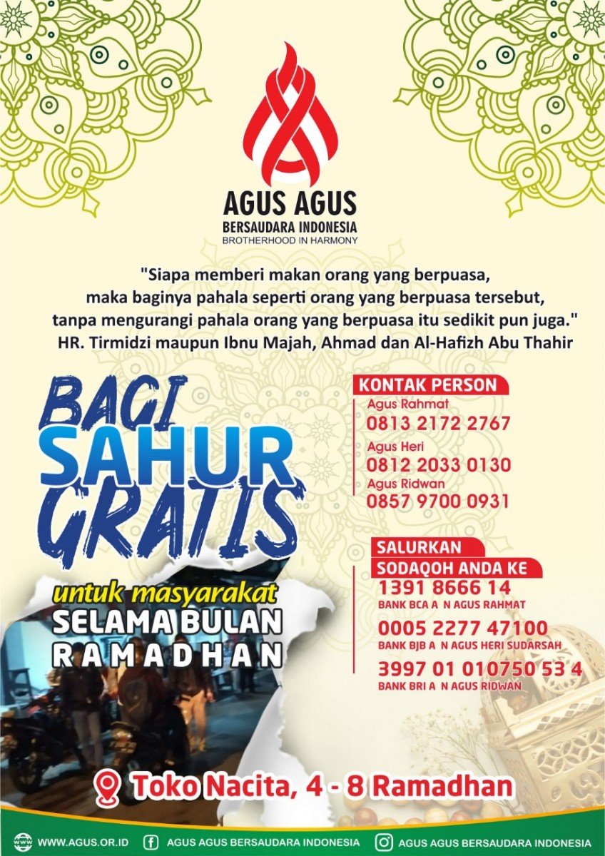 DJABARPOS.COM, Cimahi – Kegiatan Sahur Gratis yang digelar oleh Agus Agus Bersaudara Indonesia (AABI) DAC Kota Cimahi, insyaAllah akan dimulai pada hari ke empat di bulan Ramadhan, Rabu (6/4/2022). Pembagian kali ketiga sahur gratis berupa sedikitnya 50 nasi kotak itu akan disebar secara berpindah lokasi di 5 titik di Kota Cimahi, dengan jadwal pembagian selama 4 hari disetiap titiknya. Empat hari pertama pembagian sahur gratis yaitu di depan toko Alkes Nacita, selanjutnya ke Posrtran AABI Cimahi, Bunderan Leuwigajah, Perempatan Jati Cihanjuang dan Alun-alun Kota Cimahi.(Agus Ridwan)