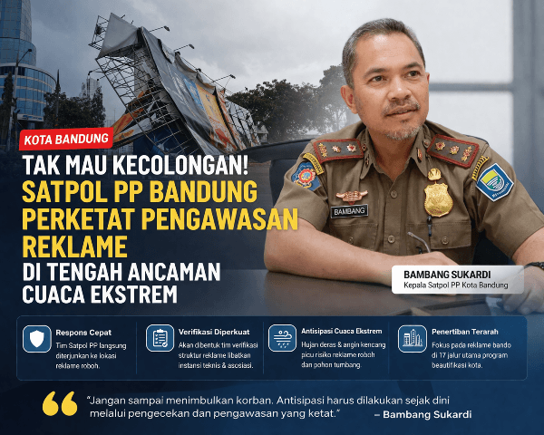 DJABARPOS.COM, Kota Bandung – Pemerintah Kota Bandung melalui Satuan Polisi Pamong Praja (Satpol PP) memperketat pengawasan terhadap reklame menyusul ancaman cuaca ekstrem yang melanda wilayah tersebut. Langkah ini diambil setelah insiden robohnya konstruksi reklame akibat hujan deras dan angin kencang.
