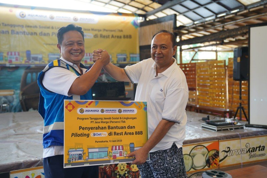 DJABARPOS.COM, Purwakarta – PT Jasa Marga (Persero) Tbk berkomitmen untuk terus memberikan manfaat kepada masyarakat melalui Program Tanggung Jawab Sosial & Lingkungan (TJSL). Kali ini, Jasa Marga menyerahkan bantuan sekaligus piloting Ekosistem Digital GetPay, khususnya fitur Point of Sales & Take and Go kepada para pelaku Usaha Mikro Kecil (UMK) di Kampoeng UMKM Rest Area Travoy Km 88 B Jalan Tol Cipularang, pada Senin (12/06).