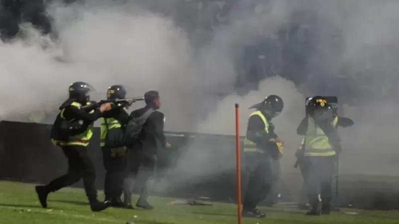 Sejumlah laporan menyebutkan, aparat kemudian menembakkan gas air mata berkali-kali, yang diantaranya diarahkan ke tribun yang disesaki penonton.
