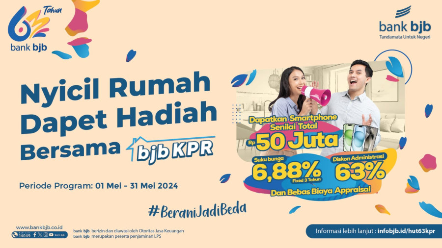 “Kami berharap program ini dapat memberikan nilai tambah bagi nasabah kami dalam memenuhi kebutuhan finansial mereka. Ayo, segera ikut programnya, kapan lagi ikut program Promo KPR dengan berbagai kemudahan, dan beragam hadiah,” ucap Widi. Untuk informasi lebih lanjut mengenai program ini, nasabah dapat menghubungi kantor cabang bank bjb terdekat atau mengunjungi situs web resmi bank bjbwww.bankbjb.co.id/ (infobjb.id/hut63kpr). (Arsy)